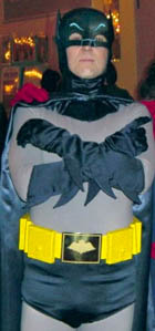 Scott: What’s the worst thing about being costume? Adam complained about the cowl and the tights being itchy… Wally: Um...yeah… [thinking] All the stuff he hated about it we made improvements on. A comfortable fabric. Supplex is more smooth finish than the original tights that were kind of a Nylon and scratchy. The boots are extremely comfortable. The belt’s fine. The cape is fine, though you kinda develop a thing for moving it around. The cowl once I got it to a point where it was looser and I got the foam in it . It sat there really nice. I guess the lack of peripheral vision is the only thing I can think of. |