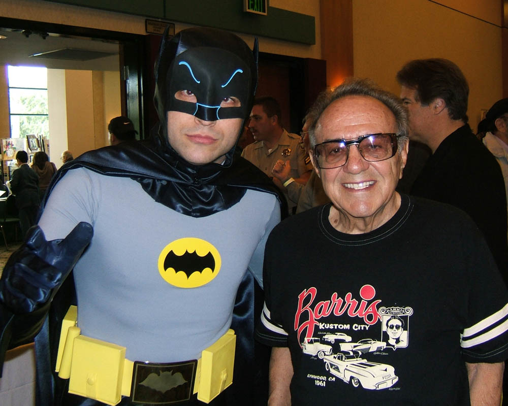 Another gentleman spotted me from a distance and made a beeline towards me. I recognized him right away. It was Batmobile builder, George Barris! He came directy up to me and handed me his card and said, “I need you for a gig coming up in May. Could you please give me a call? It’s at Petersen Automotive Museum.” Since that’s the current home of the original Batmobile from the show, I said that I would be delighted. I asked him if I could get a picture with him. We posed for JoJo who was using my camera and George quickly handed his camera to JoJo and asked for a picture as well. I then handed the card to JoJo for safe keeping. Another gentleman who was accompanying George turned to me before leaving and said, “He’s serious. He really does want you to call him.” I told him I would do so. WOW!!