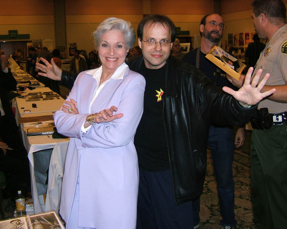 First, I have to say what an amazingly beautiful and poised lady she still is. She is quite striking in person and everything I would ever expect from a former Miss America. I proceeded to get the “business” part of it quickly out of the way and picked out a picture I wanted to have her sign. I mentioned to her that my wife and I have still had a hard time finding the exact material for Vickie’s Cat-suit. Lee said, “She’s a brave woman. That costume was torture!” I told her how abrasive the materials we had come across prior seemed to be and Lee said that she had even gotten sunburned in it while shooting the scene on top of the submarine for the movie. “The backing of the material just let the sun through and the metal fibers got really hot.” I mentioned that it seemed like that particular shoot from the movie was pretty grueling since one of the stuntmen broke his neck falling into the shallow water of the set headfirst. Her eyes got big like she suddenly remembered that going on and said, “YES!! And that was a back lot where we shot it that they filled with water. Ughh.” After a bit more fun conversation I asked to have my photo taken with her. She smiled and stood up for it.